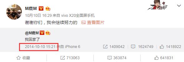 10月10日,鹿晗公开恋情后首度更博发声,转发自己当时在2014年前退团回国的博文,表示会不忘初心,继续努力。